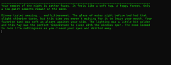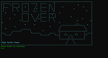 Frozen Over is a Text-Adventure using a C# console app, following a man named Mahre as he navigates suddenly waking up at a cabin in the middle of nowhere for a holiday party.