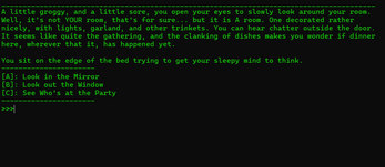 All choices will involve input of letters between A and E (typically A, B,C), and also include additional commands "clear" (clear console output from prior actions/story) and "exit/quit" (end game wherever you are).